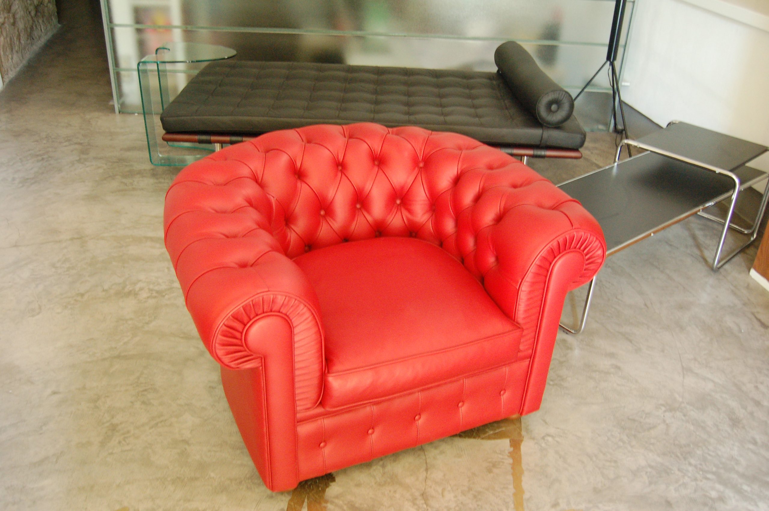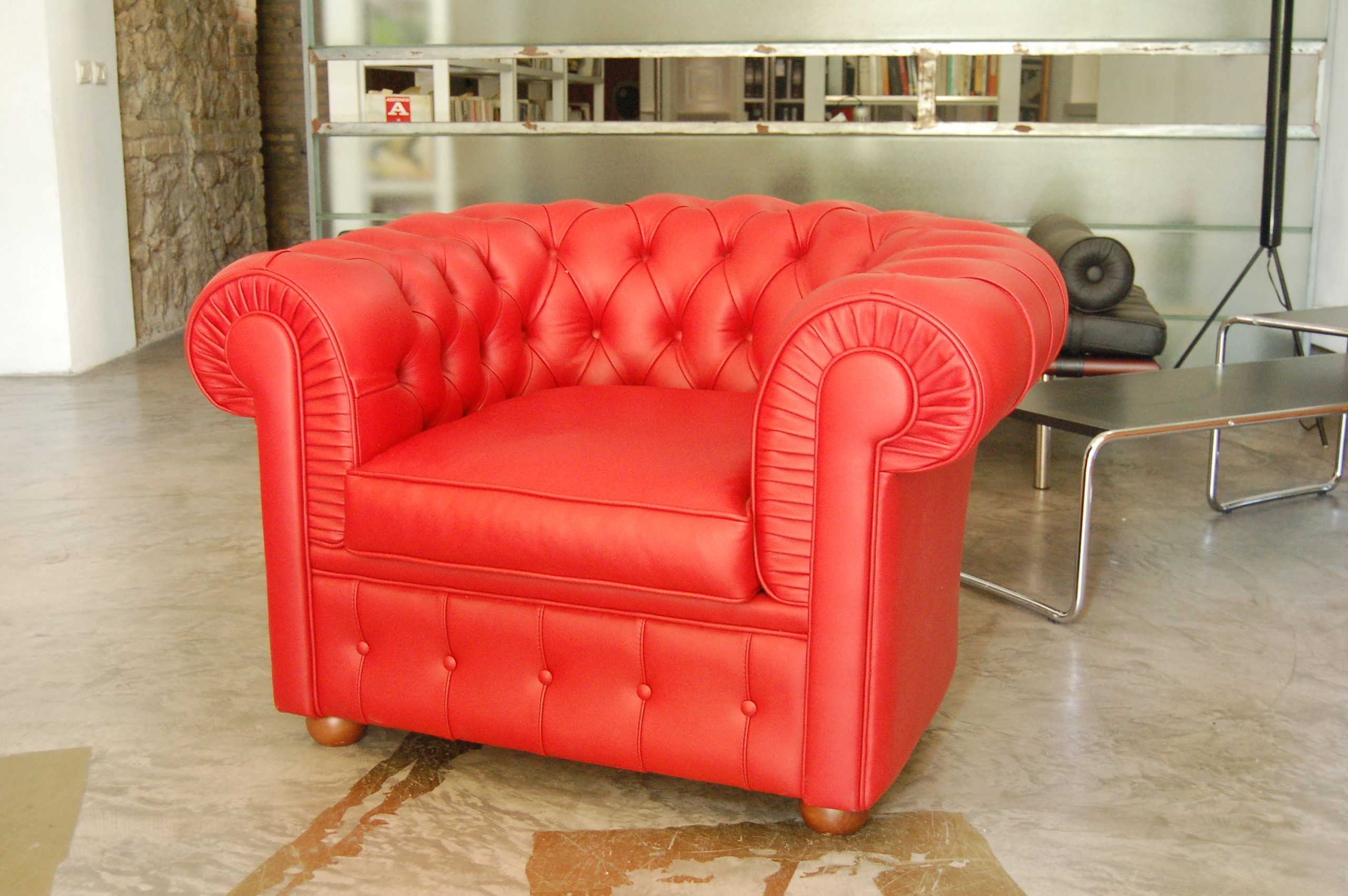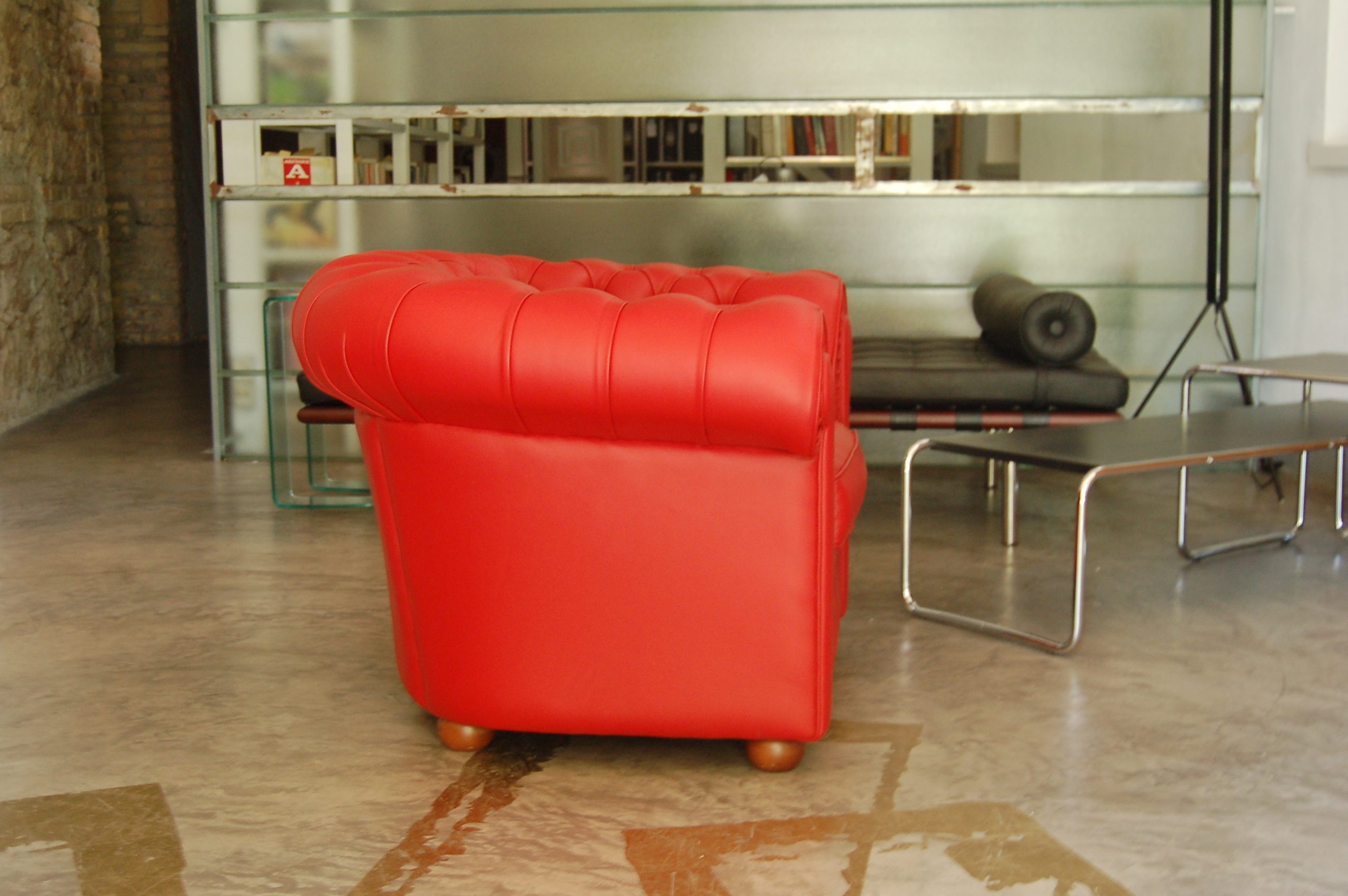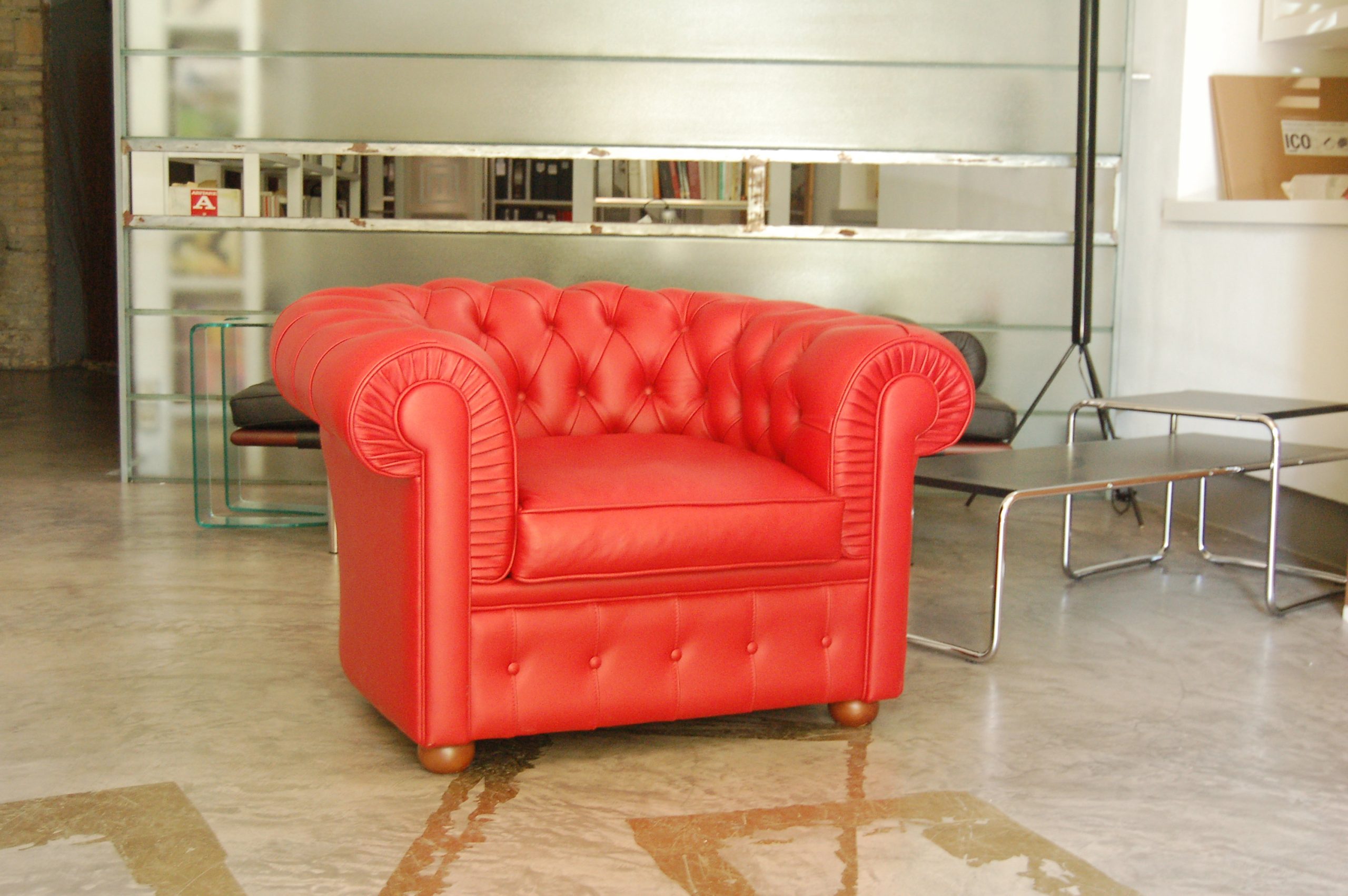 Riedizione di pubblico dominio 100% Made in Italy della poltrona Chester. Struttura in massello di faggio, imbottitura in poliuretano espanso, rivestimento in pelle (personalizzabile in base ai colori delle pelli di campionario). Piedi in legno verniciato.