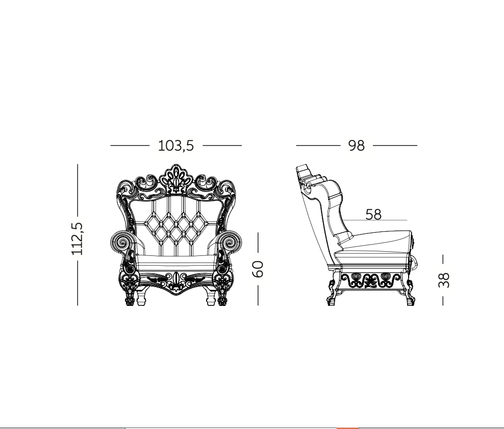 Poltrona in polietilene dallo stile barocco. Adatta anche per uso in esterno.