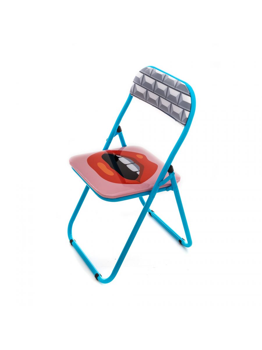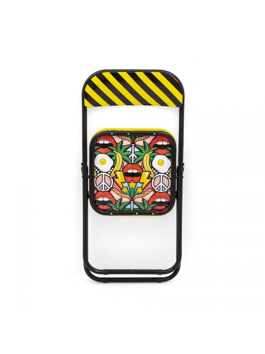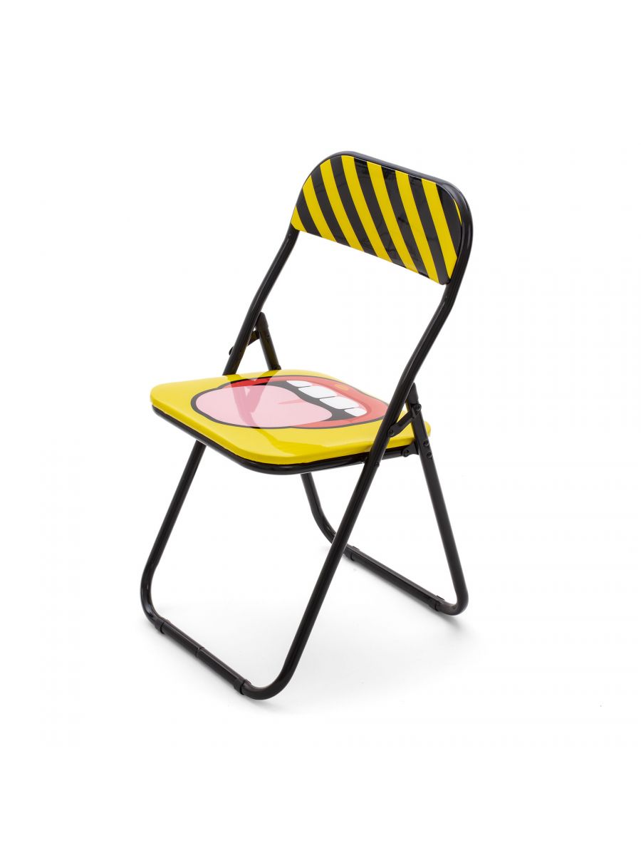 Sedia pieghevole con struttura in metallo, schienale e seduta imbottiti con le stravaganti fantasie di Studio Job. Leggera,comoda e poco ingombrante.