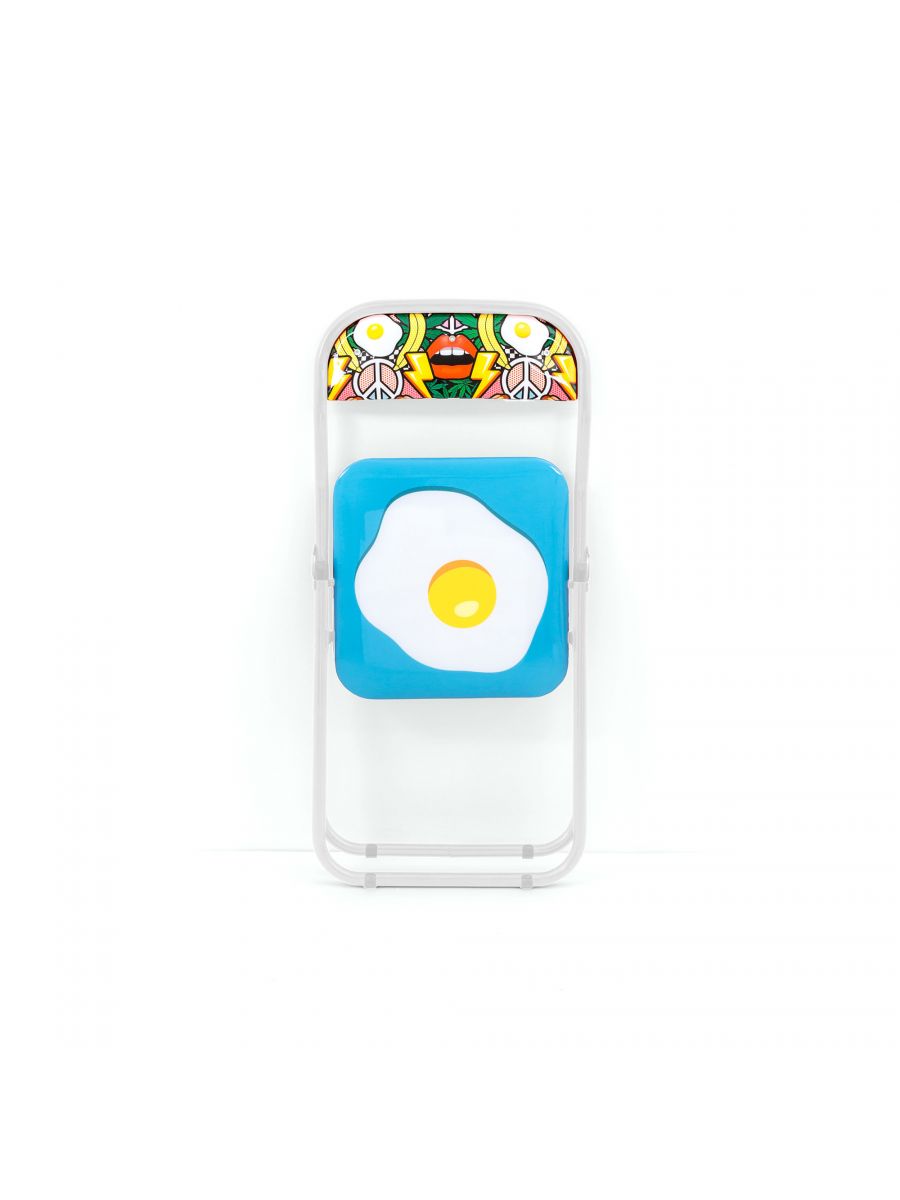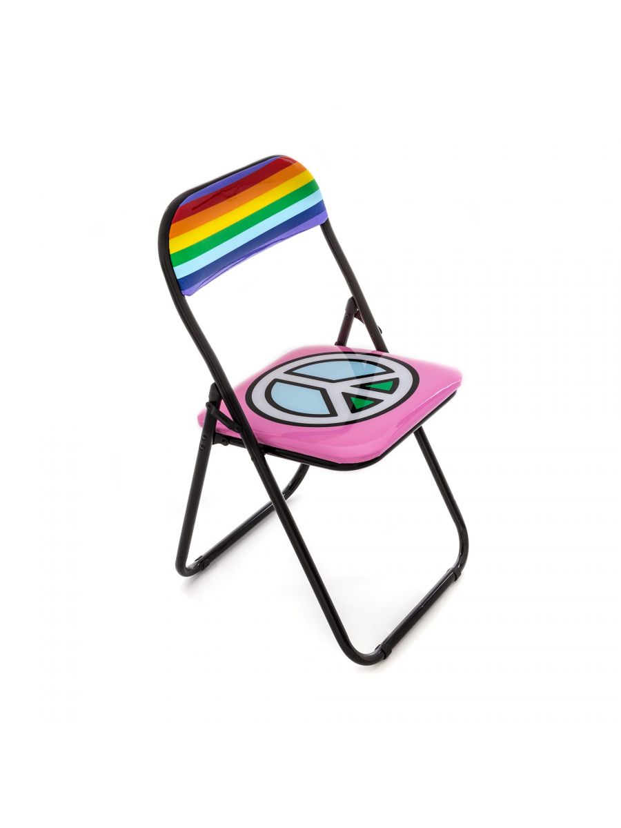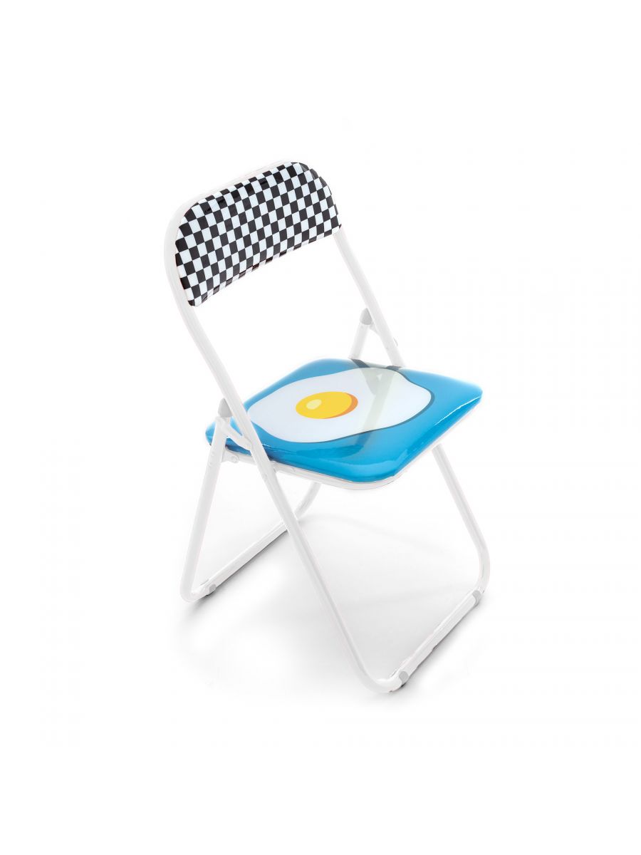 Sedia pieghevole con struttura in metallo, schienale e seduta imbottiti con le stravaganti fantasie di Studio Job. Leggera,comoda e poco ingombrante.
