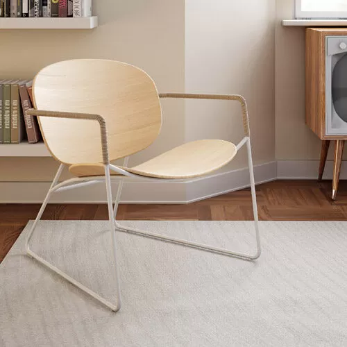 Sedia con scocca in polipropilene disponibile in vari colori; base con crociera verniciata nera e piedi in massello di faggio naturale.