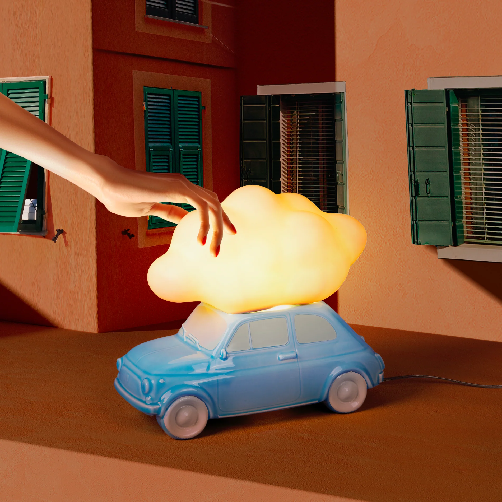 Lampada da tavolo in porcellana firmata Seletti che riproduce l’iconica 500, illuminata da una simpatica nuvola in vetro.