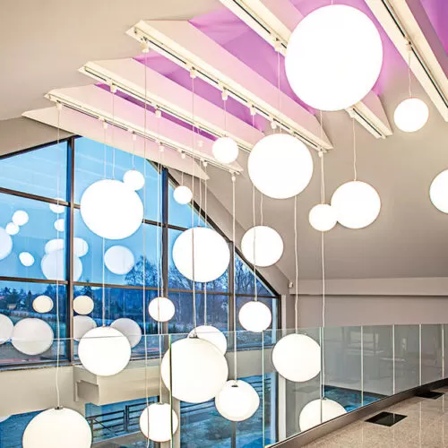 La forma lineare e minimalista e la luce soffusa rendono la collezione Globo un must have per abitazioni private e contract.